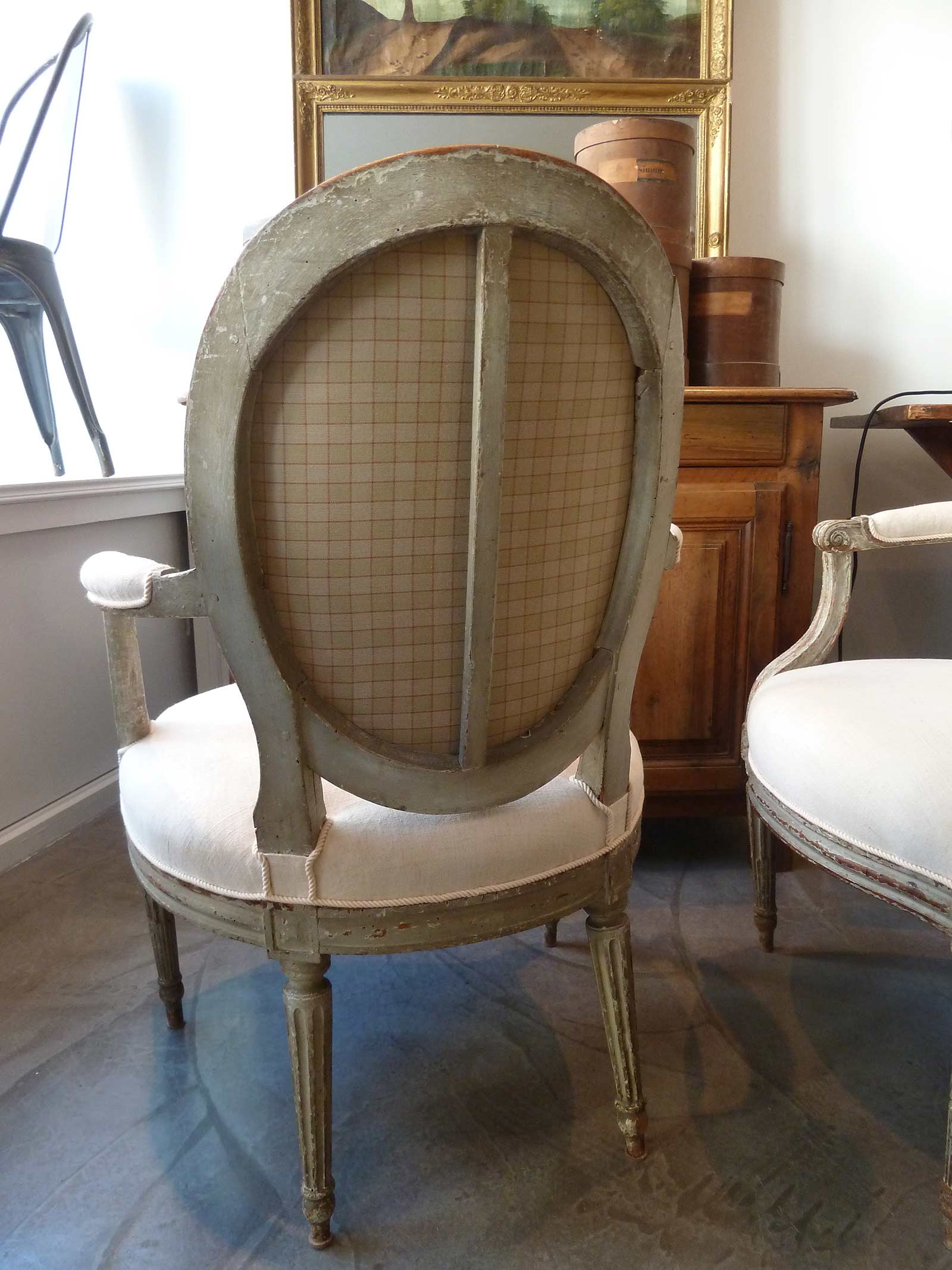 Entièrement restaurés – rechampis gris – dossier médaillon – couverts vieux draps de lin – pieds cannelés rudentés